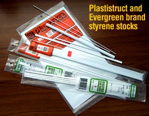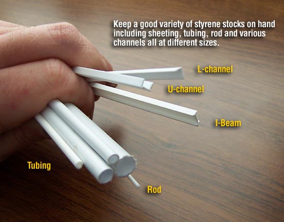 I keep a pretty well stocked assortment of rods, hex rods, channels, and tubes at various diameters. I also keep a pack of both 10 and 20 mil sheeting, and a pack of clear styrene sheeting. I find this allows me to work fast without having to run to the hobby shop all the time.